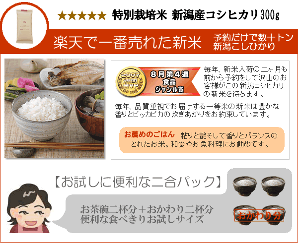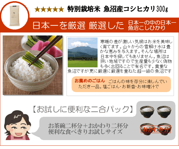 Rakuten International Shipping Item Details click here300g(お米 2合)×人気の3種類セット 新潟産コシヒカリ・魚沼産コシヒカリ・贅沢ブレンド 特別栽培米 新潟県産コシヒカリ 一等米 300g 江戸の米蔵の中でも大変人気のある銘柄です。