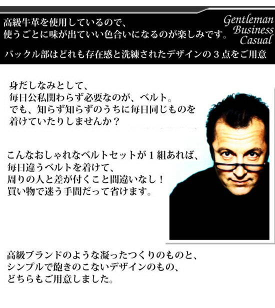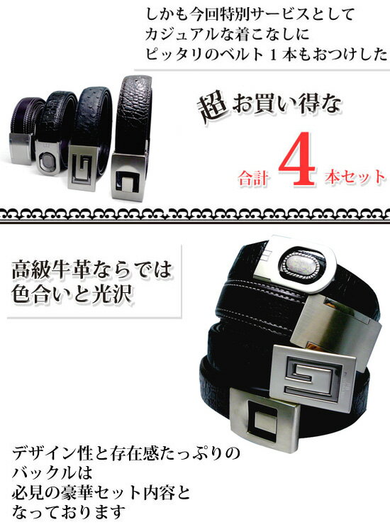 高級牛革ベルト3本に、カジュアルベルト1本をセットした合計4本セットの紳士用ベルトセットです。