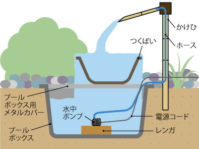 庭園では蹲踞(つくばい)や池に水を落とす仕掛けを指します。